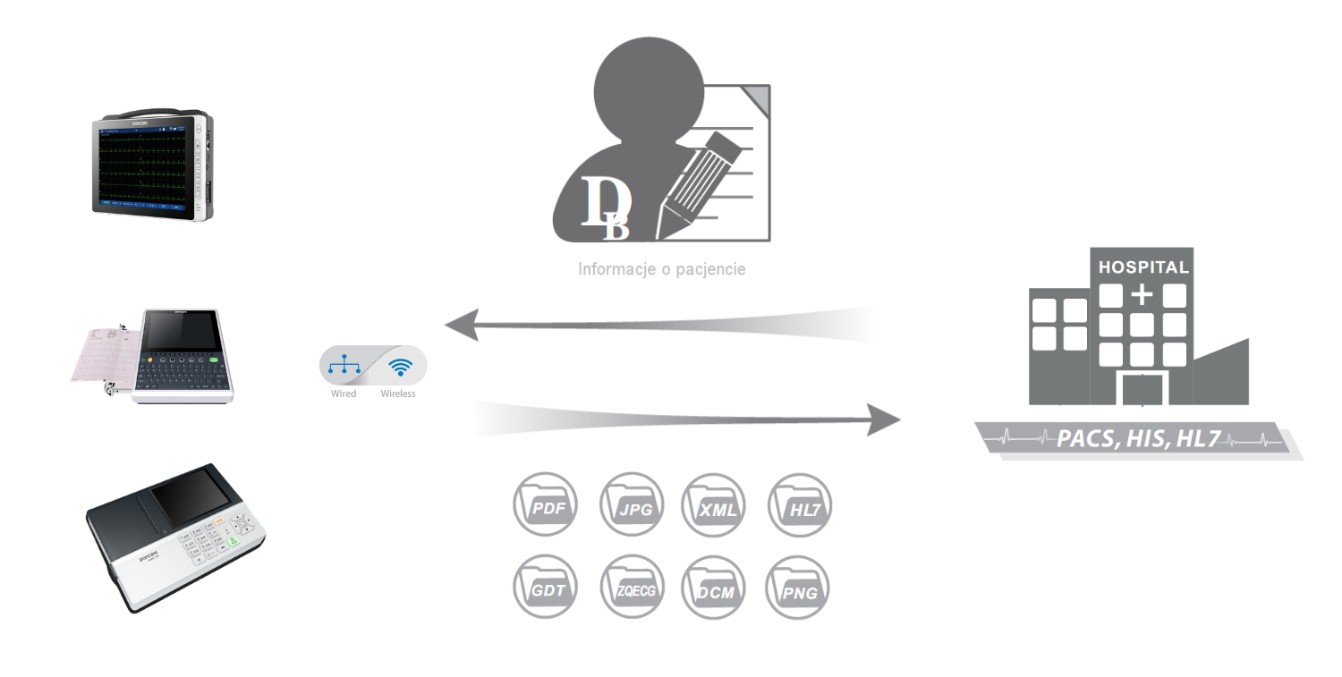 Aparat umożliwia również przesyłanie wyników EKG do innych urządzeń medycznych, takich jak systemy EMR (Elektroniczna Dokumentacja Medyczna), co ułatwia przechowywanie i udostępnianie wyników pacjentom.