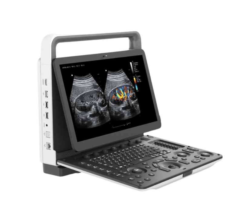 Zoncare M70 waży jedynie 6,3 kg i został wyposażony w wygodną rączkę transportową oraz wydajną baterię, co czyni go doskonałym rozwiązaniem do pracy mobilnej. Ergonomiczna konstrukcja obejmuje: 15,6-calowy monitor medyczny LCD z regulacją kąta nachylenia do 70°, podświetlaną klawiaturę z folią ochronną odporną na zachlapania oraz demontowalny uchwyt na głowice i baterię